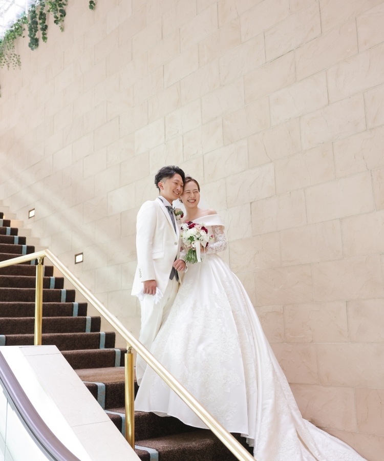 ファーストミートでおふたりだけの時間を楽しんだ後、ご親族控室へ向かう階段で幸せいっぱいのショットを撮影!
