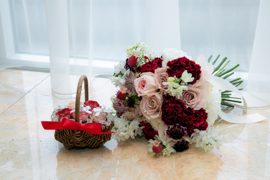 - ご新婦がお好きな赤色のお花を使ったクラッチブーケ。深紅のカーネーションとニュアンスピンクのバラをメインに、クレマチスの仲間のベルテッセンが愛嬌たっぷり。