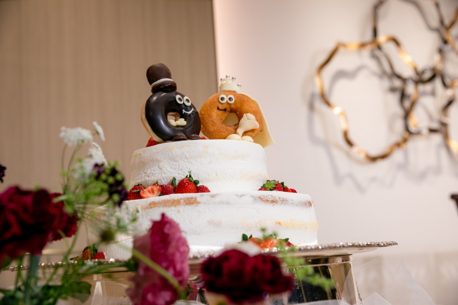 - ウエディングケーキは二段のネイキッドケーキにフレッシュなベリーを飾って。トップには愛らしい花婿&花嫁ドーナツが見つめ合っています♡