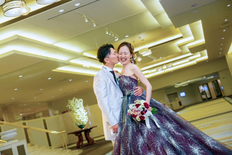 - お色直しでは、大輪の花火のようなグリッターが煌めくバーガンディーカラーのドレスへお召し替え。ご新郎も淡いラベンダーのタキシードで花嫁さまをエスコート。