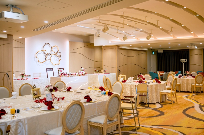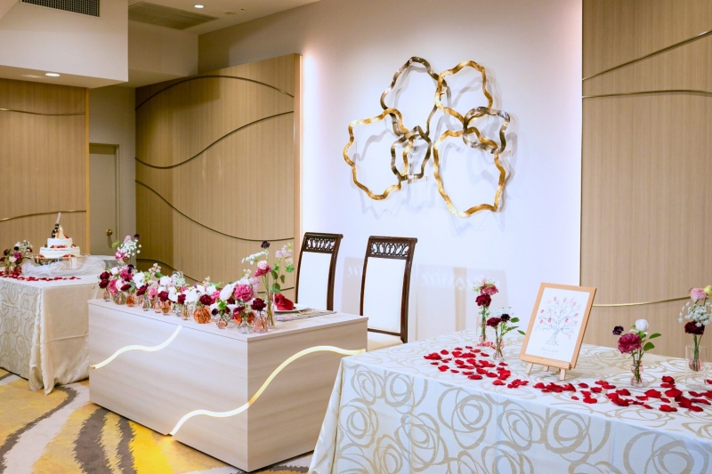 - 高砂を含む会場装花は赤色をアクセントにエレガントな印象。ファーストバイトで召し上がったドーナツが新郎新婦を優しく見守ります。
