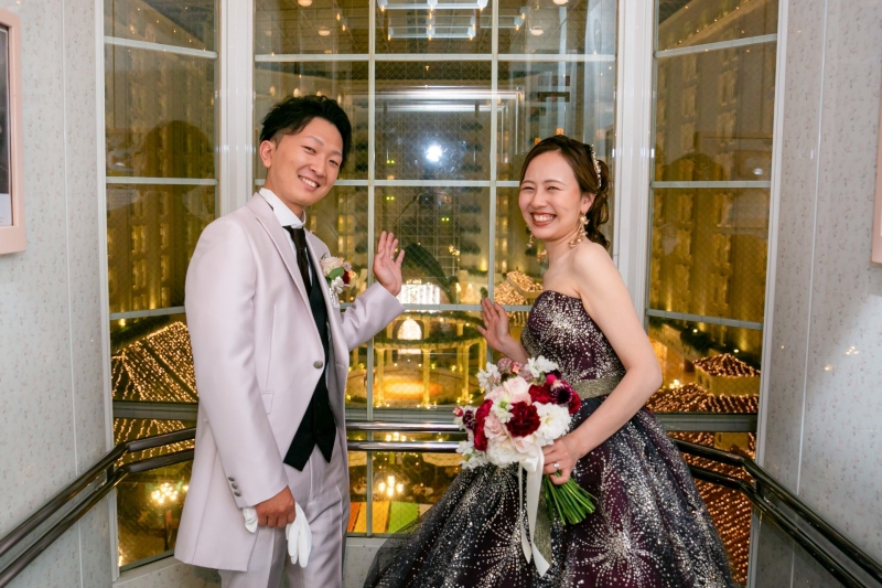 - ご披露宴のお開き直後には、パークから打ちあがる花火を皆様とご鑑賞。ゲストは当館にご宿泊なさって夢の続きをお部屋でゆっくりと楽しまれました。