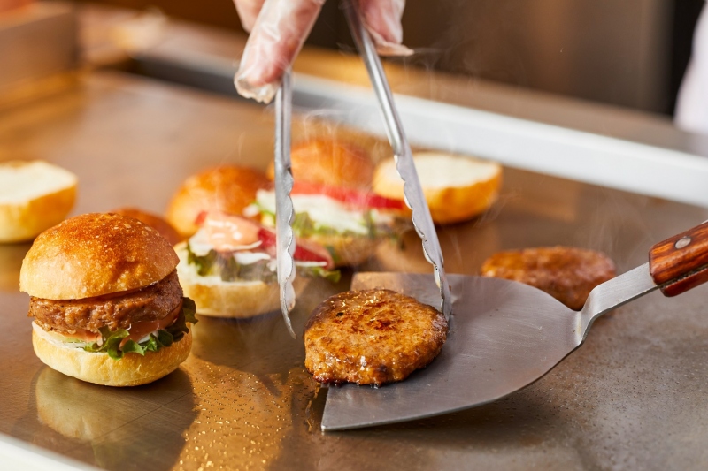 目の前で仕上げるハンバーガーにおにぎり、定番のオムレツや和食小鉢の数々。