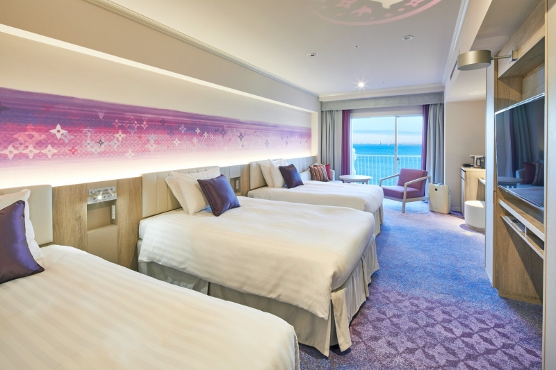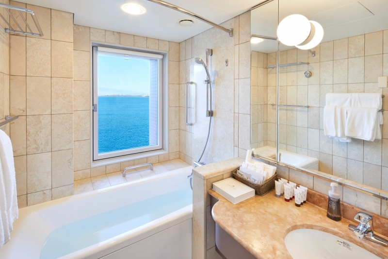 写真のニッコーデラックスルームは、ベッドからもバスルームからも、一面に広がる海が見えます。