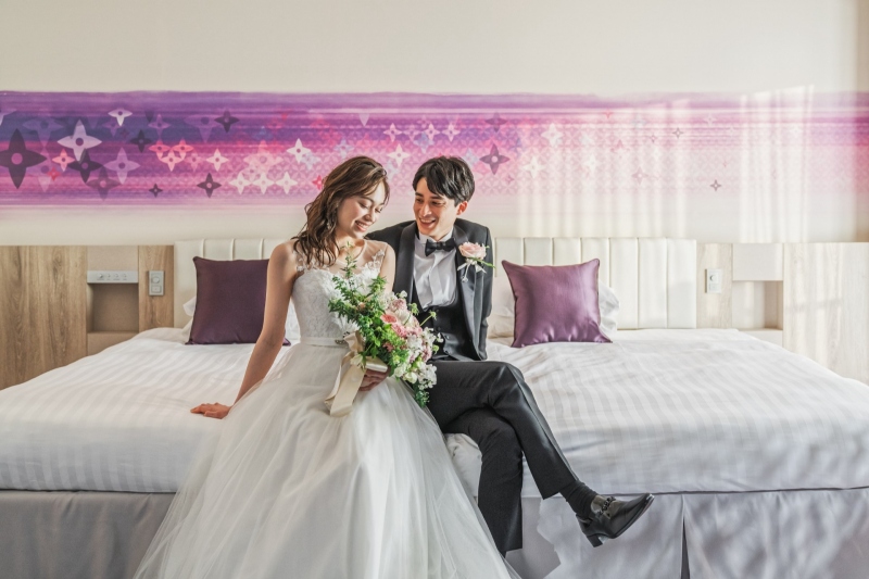 お仕度が済んだらそのまま撮影を。結婚式当日を過ごしたお部屋での写真は、きっと思い出の一枚に。