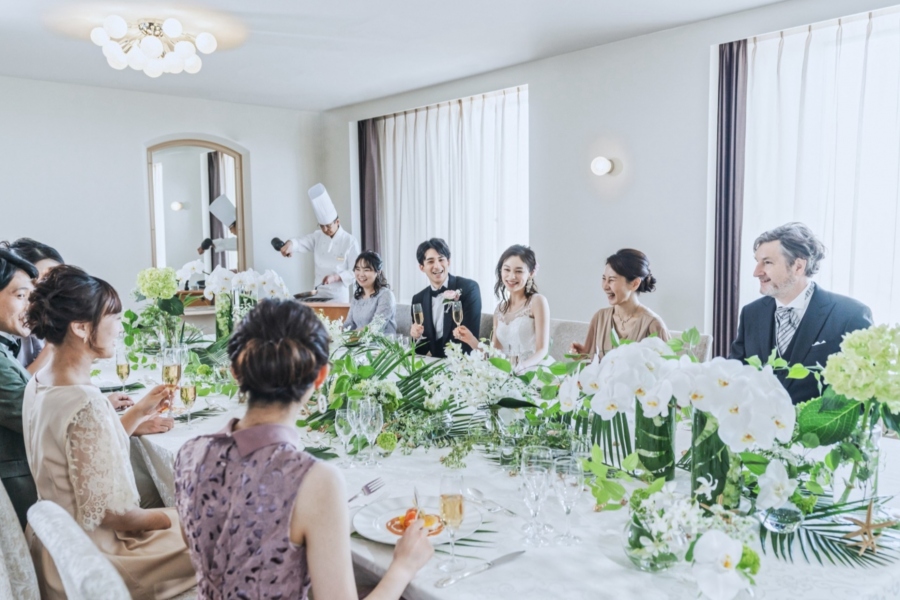 挙式でご家族に晴れ姿を見せたら、和やかな会食へ。