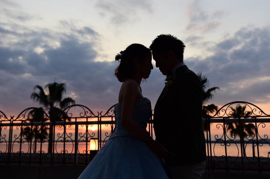 おふたりは、海に沈む夕日をバックに記念写真をどうぞ。