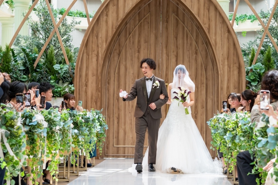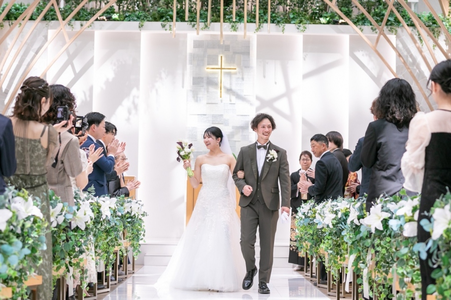 ゲストからの祝福の中、笑顔で一緒に祭壇まで歩まれたおふたり。