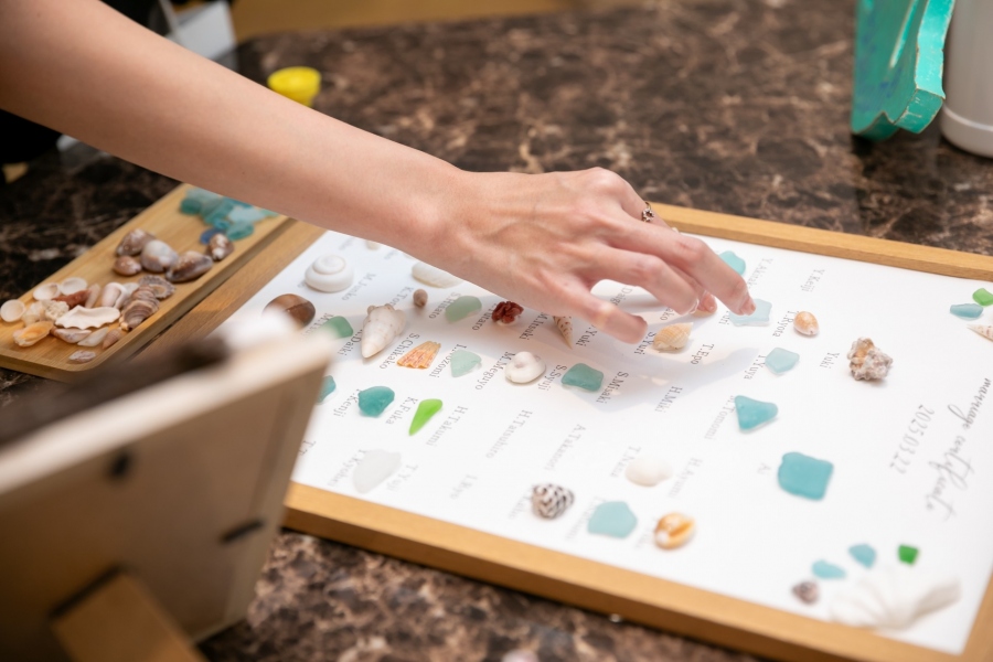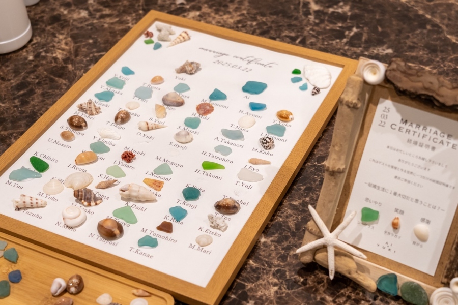 - 海からの贈り物を使い、ゲストの祝福が詰まった世界でひとつだけの結婚証明書。いつまでも思い出に残る特別な作品が完成しました!