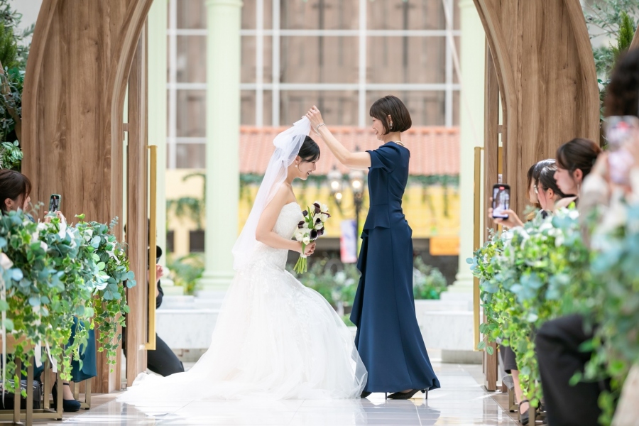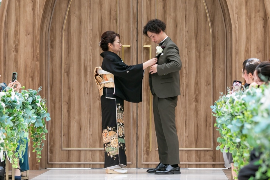 おふたりのご入場のシーンでは、それぞれお母様に仕上げのお仕度をしていただきました。