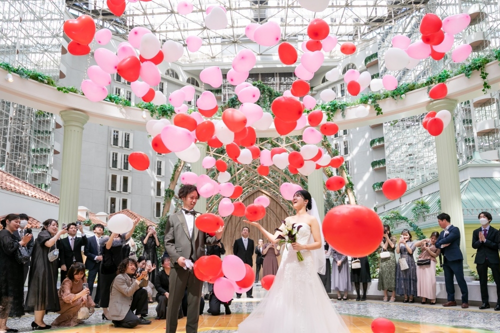 天井から舞い降りるバルーンシャワーは、挙式後に皆様と一緒に楽しめる演出。ゲストも笑顔で素敵な瞬間をカメラに収めます。