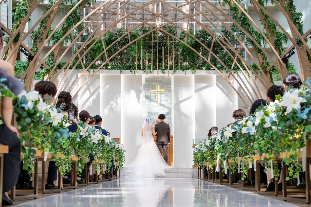ゲストからの祝福の中、笑顔で一緒に祭壇まで歩まれたおふたり。