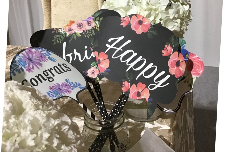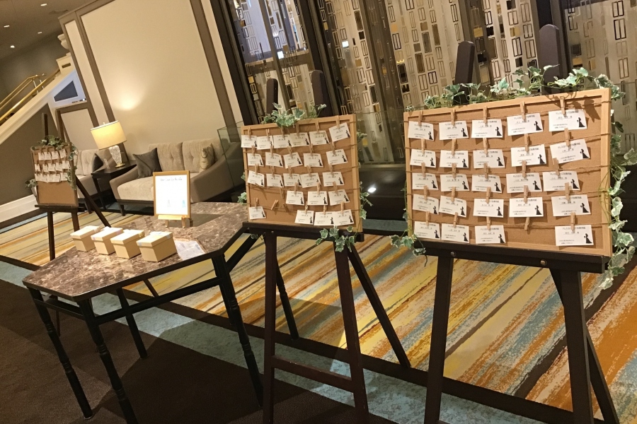 メインテーブルの両端にはご友人との記念写真で使える、フォトフロップスを手作りでご準備。