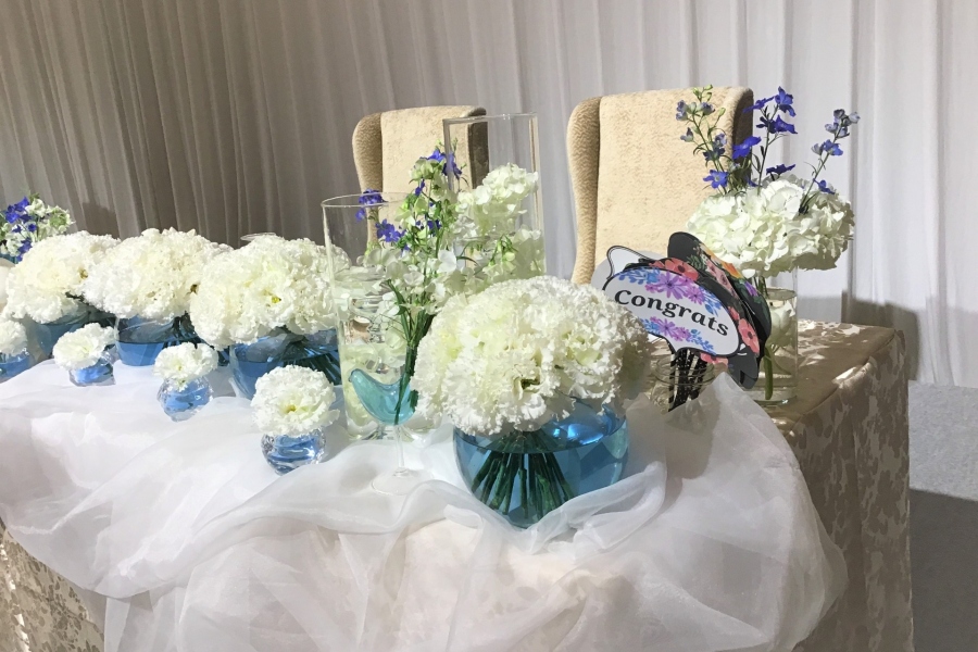 装花は白を基調とし、アクセントにアイボリーのお花で仕上げたすっきりとしたデザインです。