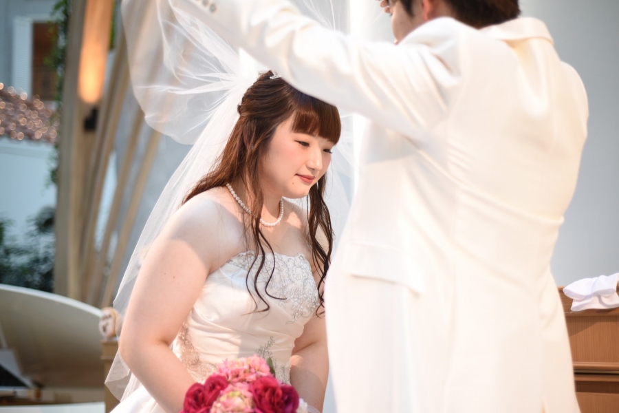 お父様との新婦入場、ベールアップ、ログブックへのご署名。