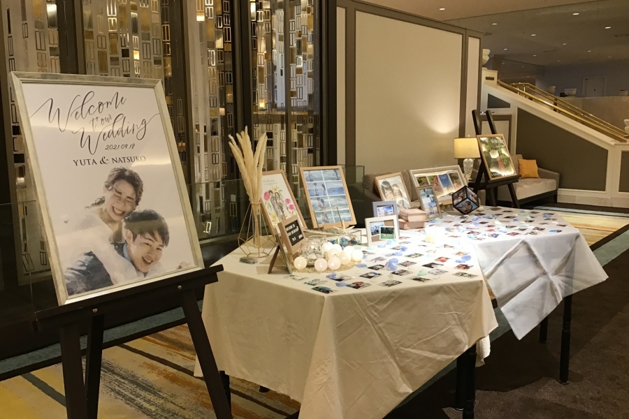 宴会場エントランスを入ってすぐのホワイエにウェルカムスペースを作りました。