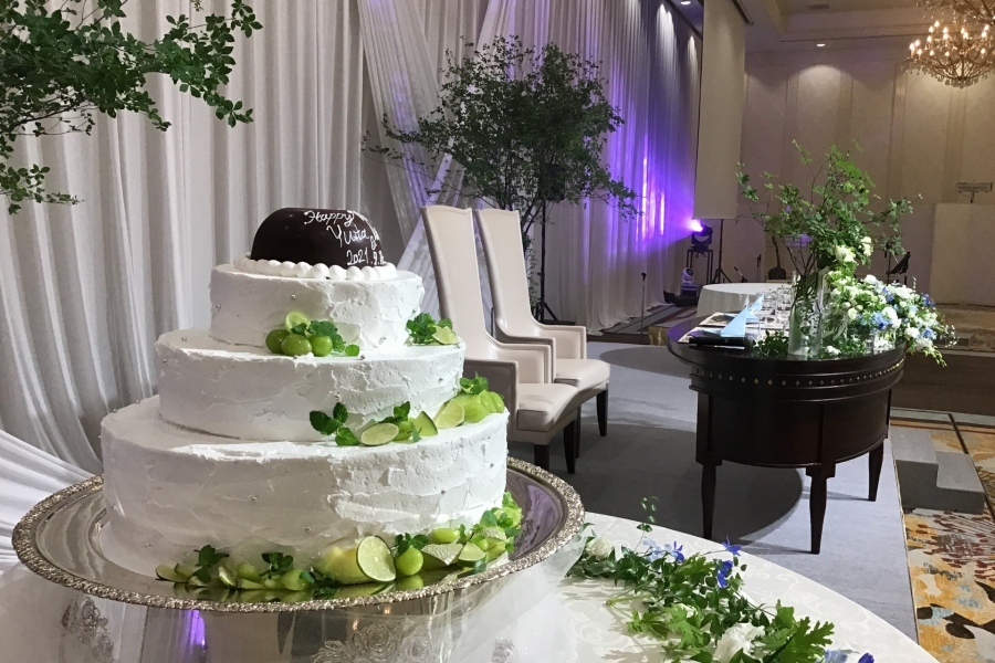 お花はガラスの器に活け、ケーキもグリーンで飾り、透明感のある爽やかなコーディネートです。