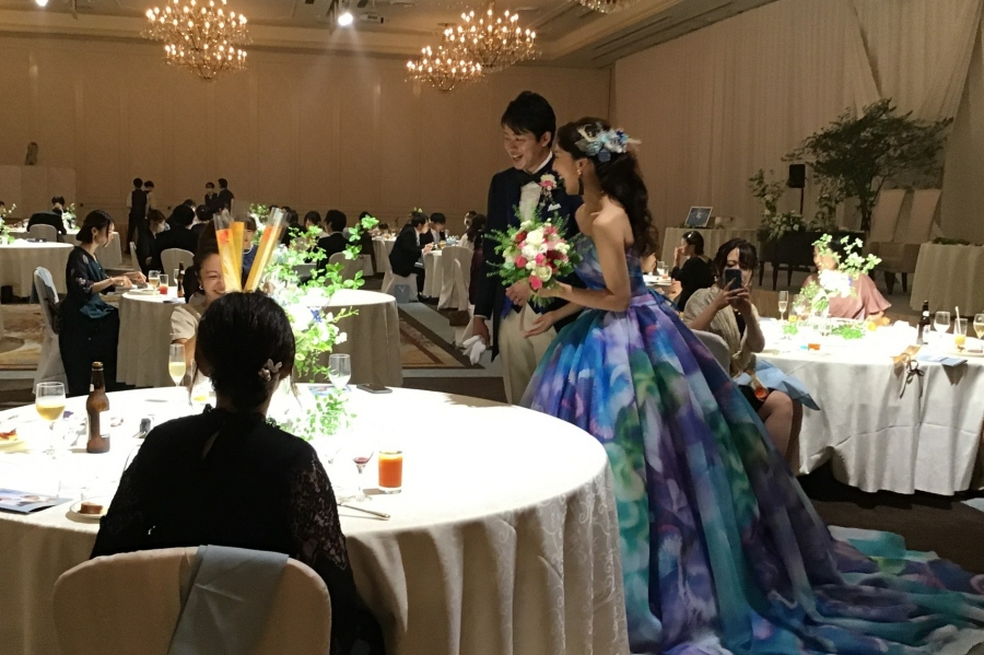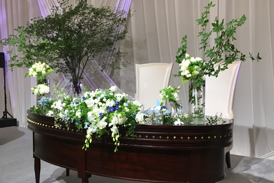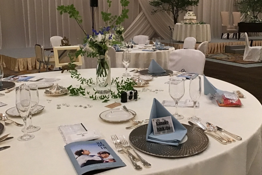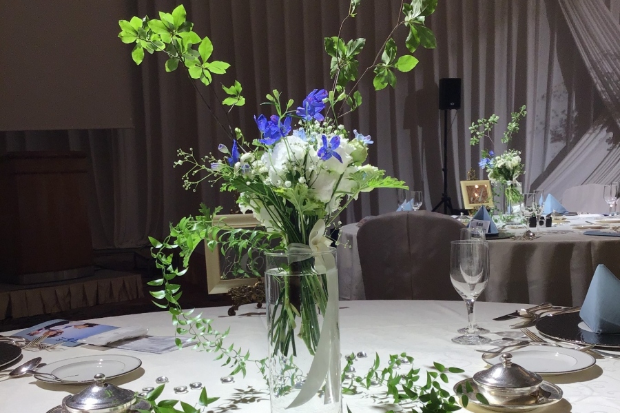 お花やナフキンにブルーを使ったテーブルコーディネートは、おふたりのお色直し衣裳とリンクしていました。