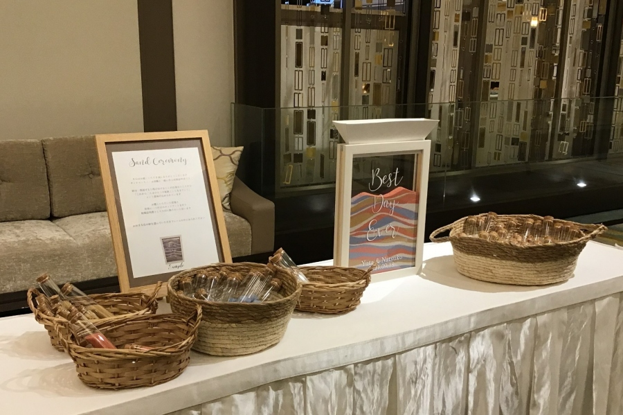 おふたりが用意した様々な色のカラーサンドを、ゲストがフレーム型の容器に重ねて入れていく、サンドセレモニー。