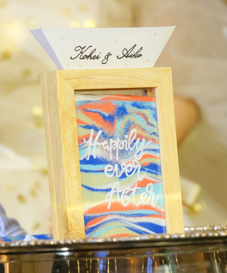 色のついた砂をおひとり1色ずつ注いでいき、再入場後のおふたりが仕上げをして、世界にひとつのアートが完成!