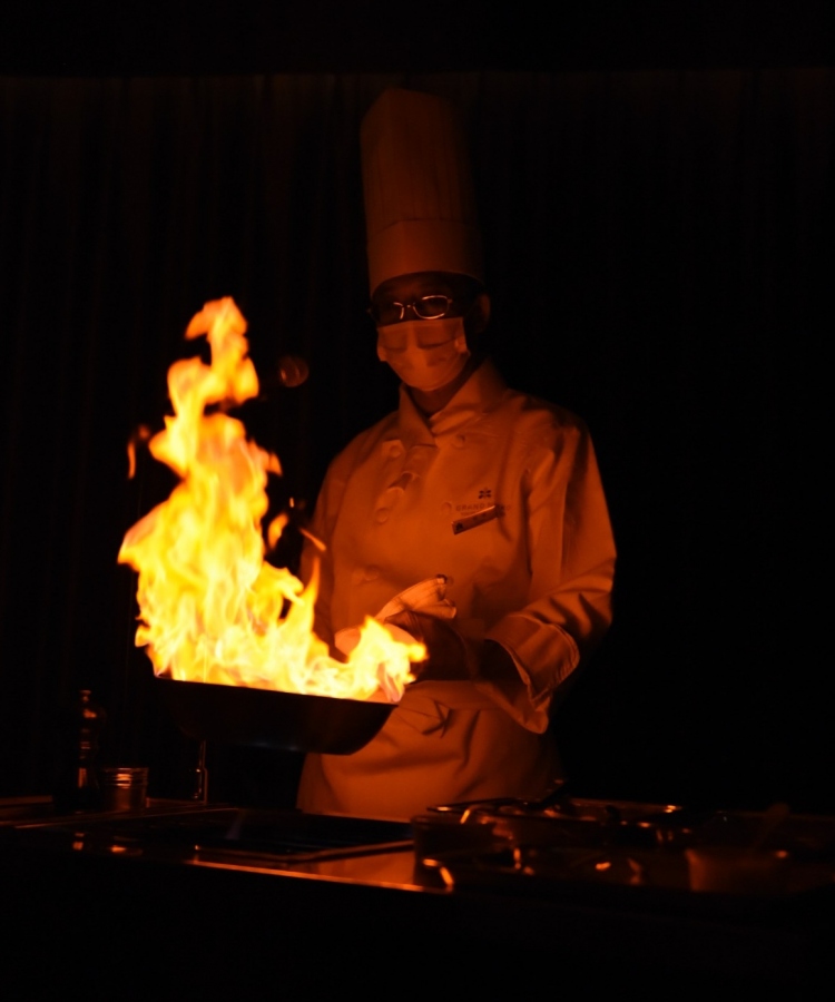 会場が真っ暗になり、シェフの合図で一気に炎が上がります。