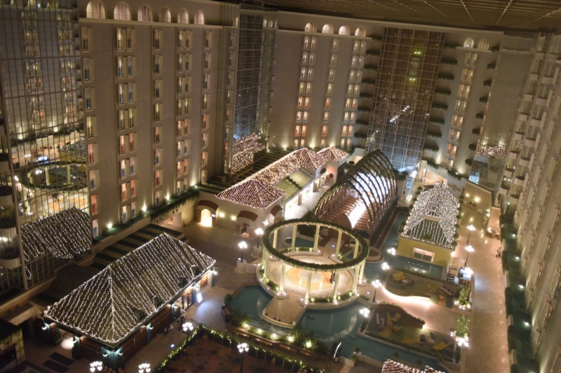 ゲストがお帰りのエレベーターの中からは、街灯が光るロビーをご覧いただけます。